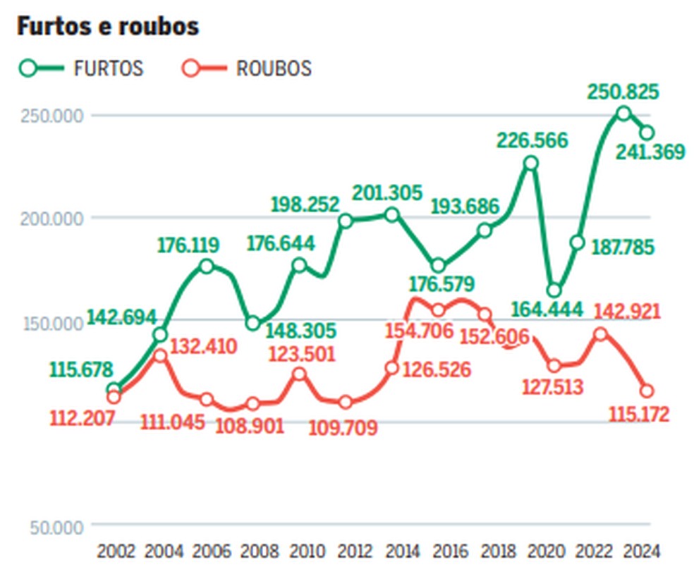 Na contramão desta tendência,os furtos atingiram o maior número da série histórica disponível em 2023,com 250.825 casos,e o segundo maior índice em 2024,com 241.369. A alta está ligada a um tipo de crime que se tornou comum na cidade: celulares tirados das mãos dos usuários nas ruas.