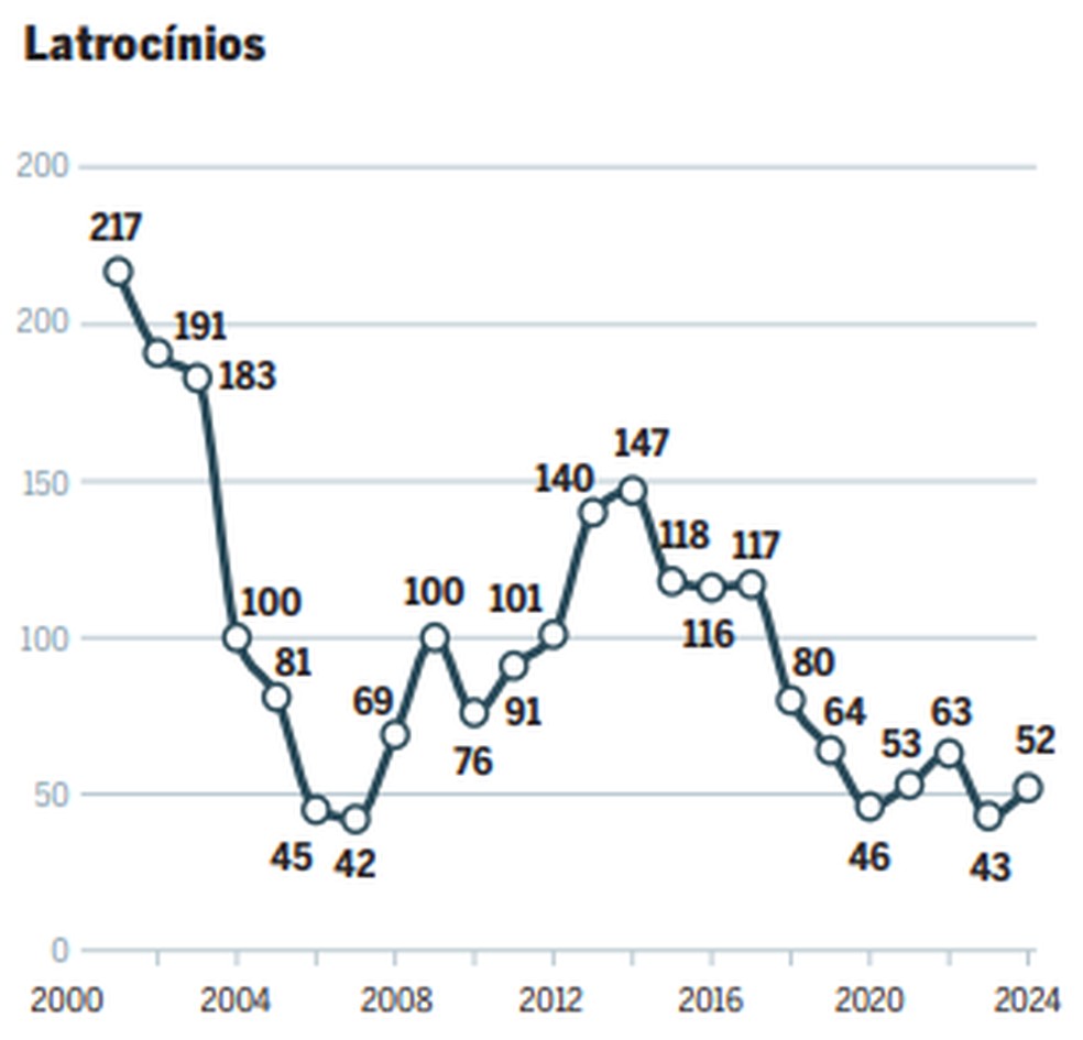 A violência destes episódios assusta,mas os dados da Secretaria de Segurança Pública (SSP-SP) mostram que os crimes violentos registram um recuo histórico na cidade. Os latrocínios (roubos seguidos de morte) estão em queda desde 2001,quando 217 pessoas morreram vítimas desse tipo de crime. No ano passado,foram 52. Em comparação a 2023,houve nove casos a mais,mas a série histórica aponta uma tendência de queda desde 2014,quando o patamar era de 147 casos. Os roubos também caíram desde 2014 e atingiram em 2024 o menor índice desde 2013,com 115.172 casos.