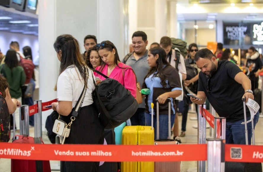 Passageiros formam longas filas na área de check in do aeroporto Santos Dumont — Foto: Guito Moreto/Agência O Globo