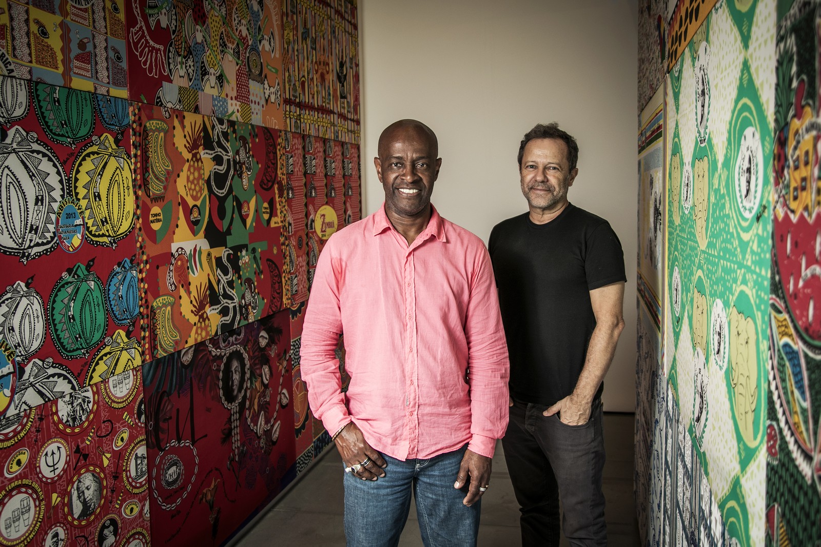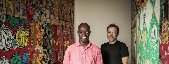 Vik Muniz (à esq.) e Alberto Pitta,diante de instalação com estamparia criada pelo spara Vik Muniz (à esquerda) e Alberto Pitta,diante de instalação com estamparia criada pelo soteropolitano para blocos — Foto: Guito Moreto