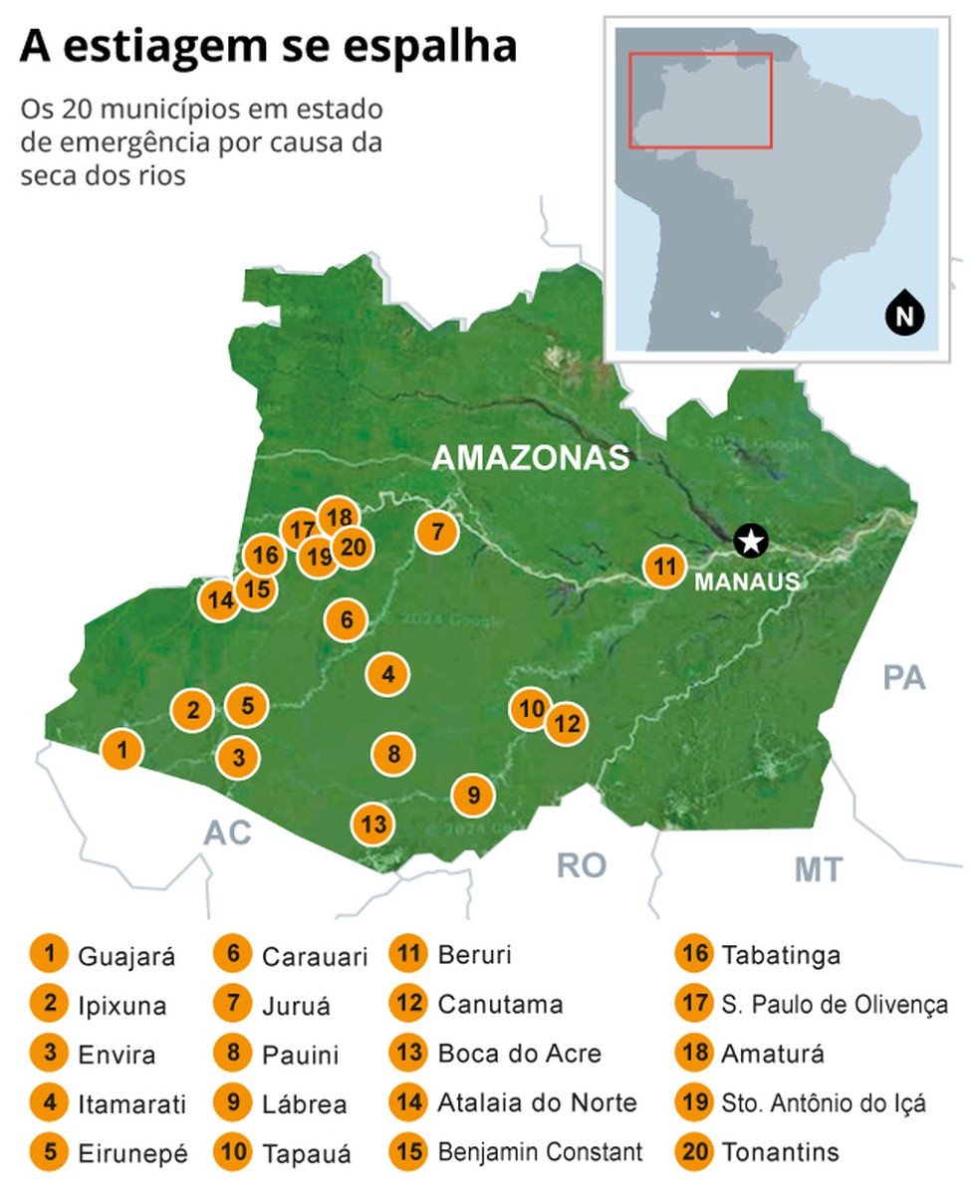 Mapa mostra como a estiagem se espalha no estado do Amazonas — Foto: Arte O Globo