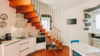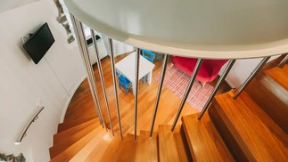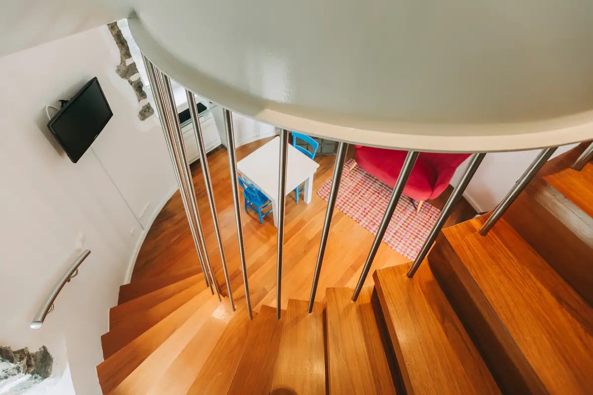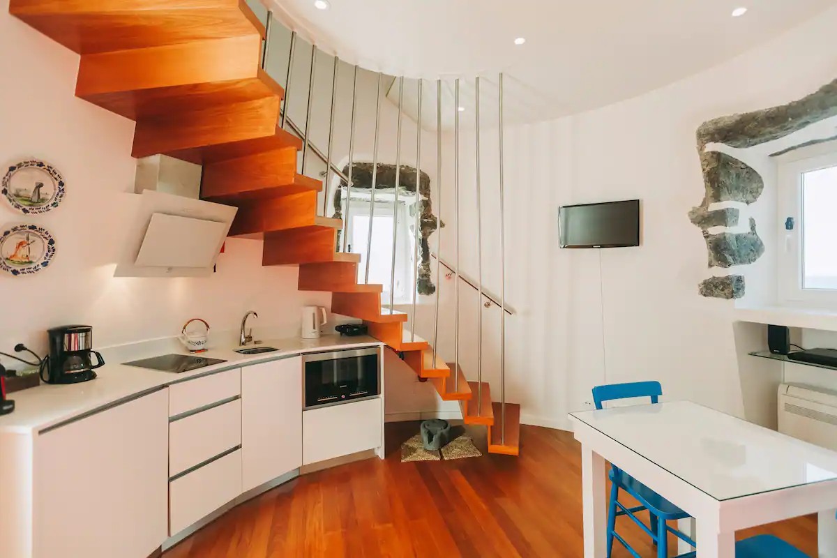 Escada íngreme leva ao andar de cima do moinho,onde fica o quarto — Foto: Divulgação