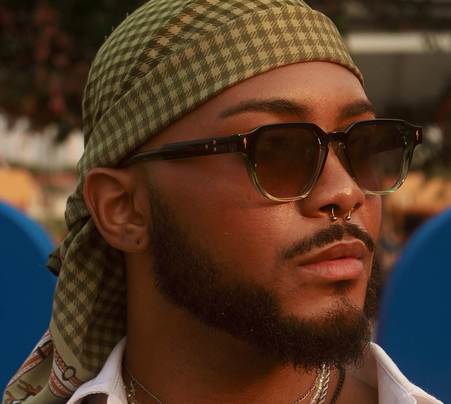 O cantor Matheus Amaral,entrou na moda do lenço com os óculos — Foto: Alllexandros