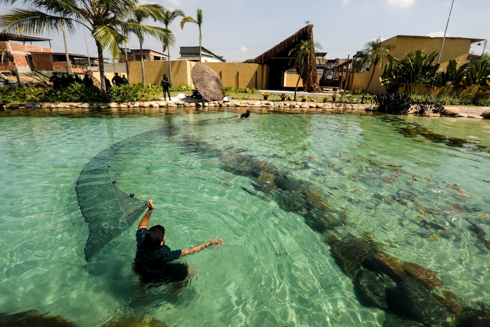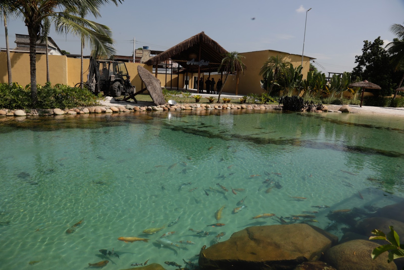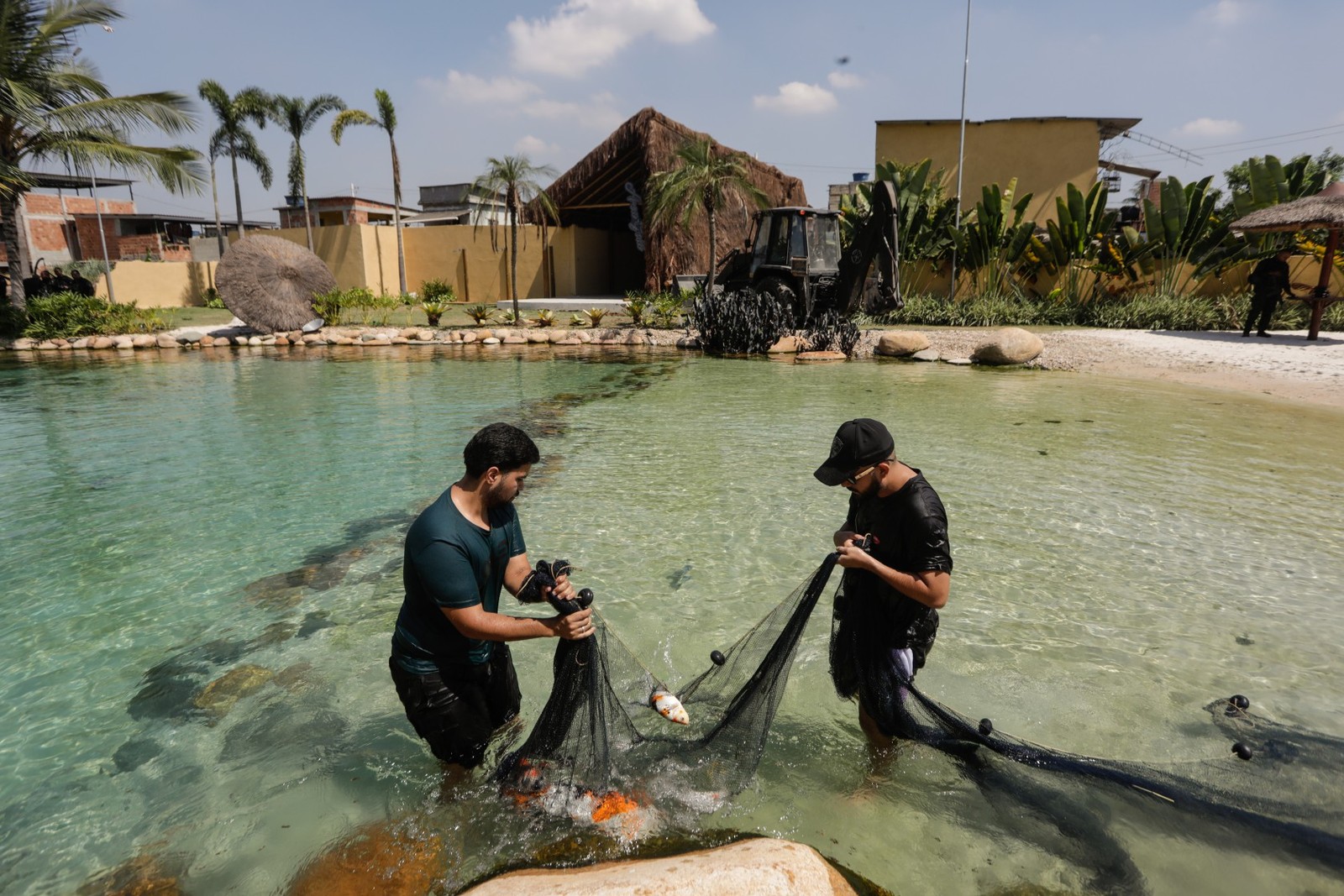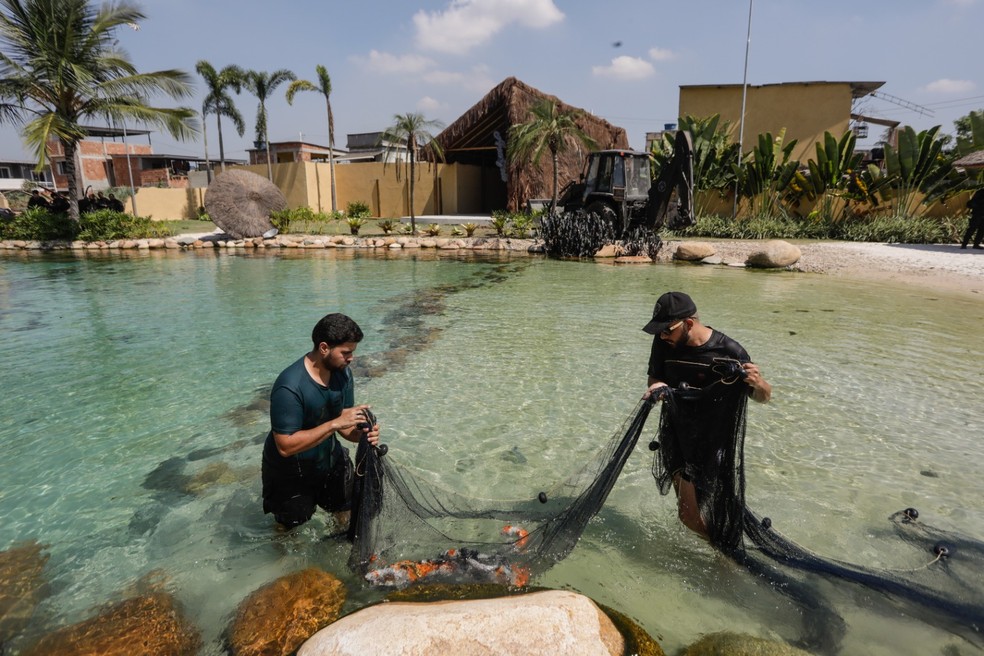 Polícia retira carpas de lago artificial do resort do Peixão — Foto: Gabriel de Paiva/ Agência O Globo