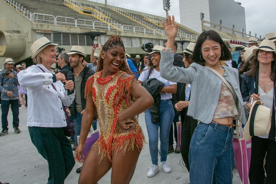 Cerca de 150 participantes do GT de Turismo do G20,de mais de 30 países,tiveram a chance de participar de uma imersão no Carnaval,neste domingo,em pleno inverno. Nem a chuva fraca impediu os visitantes de caírem no samba em um mini desfile da Viradouro,campeã do carnaval 2024. Os participantes foram convidados a descer para a pista,onde acompanharam um minidesfile com passistas,bateria,mestre sala e porta-bandeira,e até a cobra que encantou a comissão de frente da escola na conquista do título. Para completar,a interpretação do mestre Vander Pires.