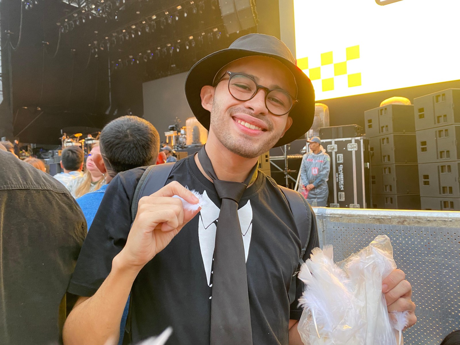 Nícolas Caldas levou 600 penas para distribuir aos fãs do Arcade Fire — Foto: Mariana Rosário
