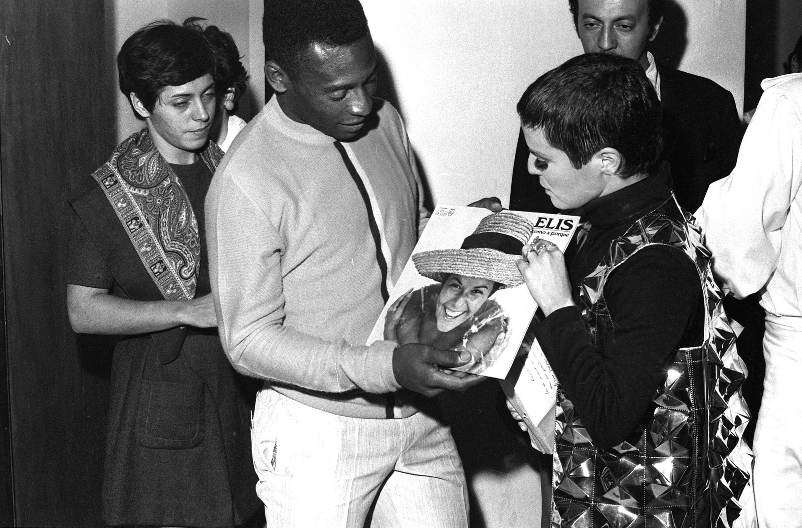 A cantora Elis Regina e o jogador de futebol Pelé gravando o compacto "Tabelinha" com duas músicas,em 1969. — Foto: Acervo / Agência O Globo