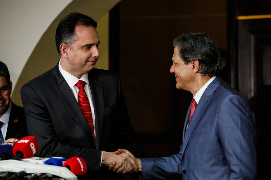 O ministro da Fazenda,Fernando Haddad,e o presidente do Senado,Rodrigo Pacheco — Foto: Brenno Carvalho / Agência O Globo
