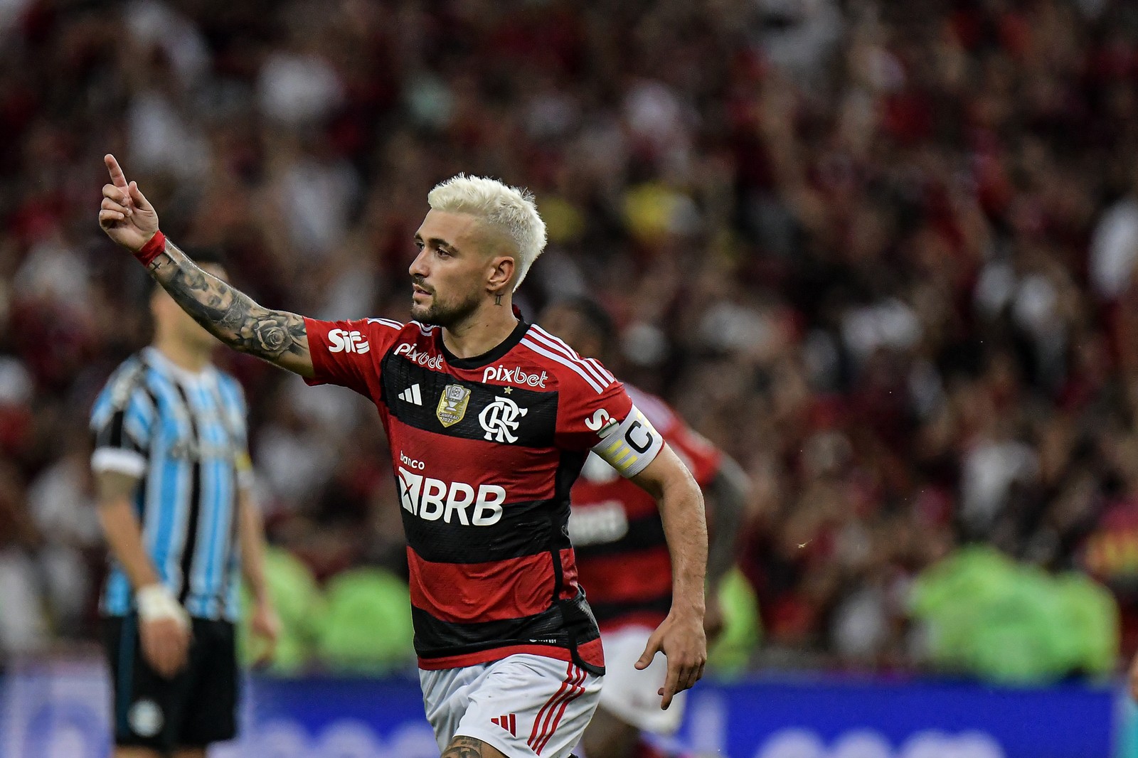Arrascaeta comemora seu gol durante partida do Flamengo contra o Grêmio no Maracanã pela Copa do Brasil — Foto: Thiago Ribeiro/AGIF