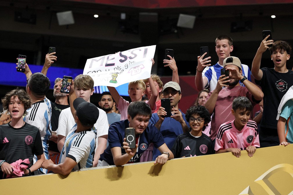 Torcedores do Inter Miami levam cartaz para Messi em jogo do Mundial — Foto: Kevin C. Cox/Getty Images/AFP