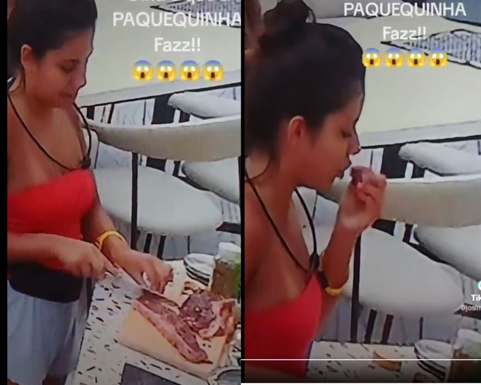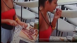 Gabriel comeu um pedaço de carne crua no "BBB 26" enquanto temperava o alimento — Foto: Reprodução/Globoplay