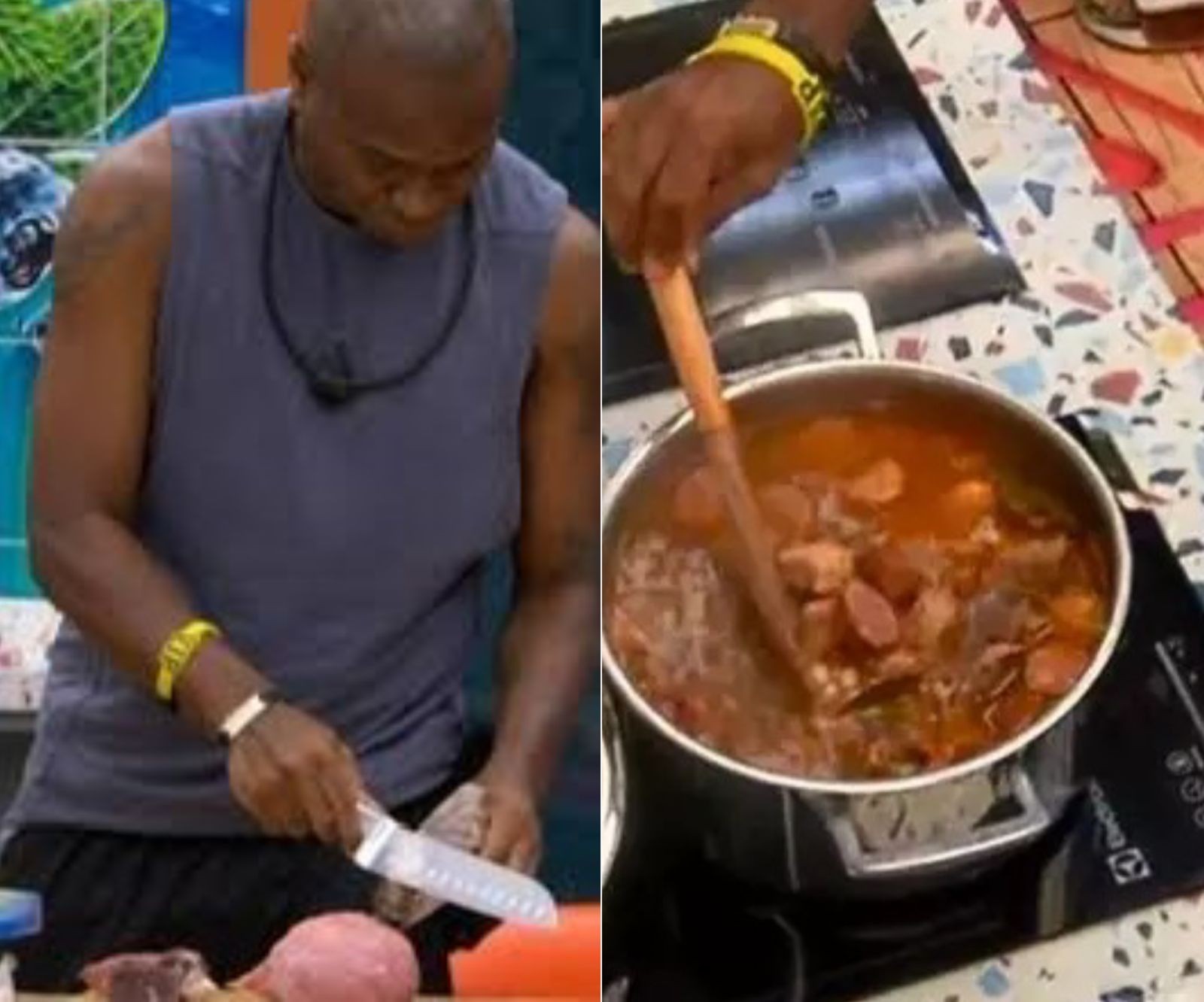 Quando estava na casa,Edilson foi ao banheiro e não lavou as mãos depois. Em seguida,foi flagrado preparando o feijão para seus colegas comerem — Foto: Reprodução/Globoplay