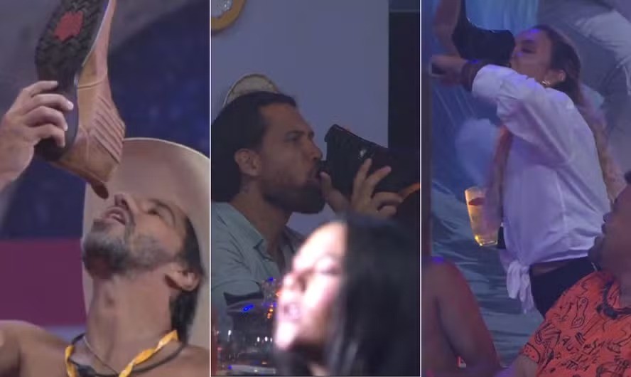 Em uma das festas,os brothers tomaram bebidas direto da bota de Sarah Andrade — Foto: Reprodução/Globoplay