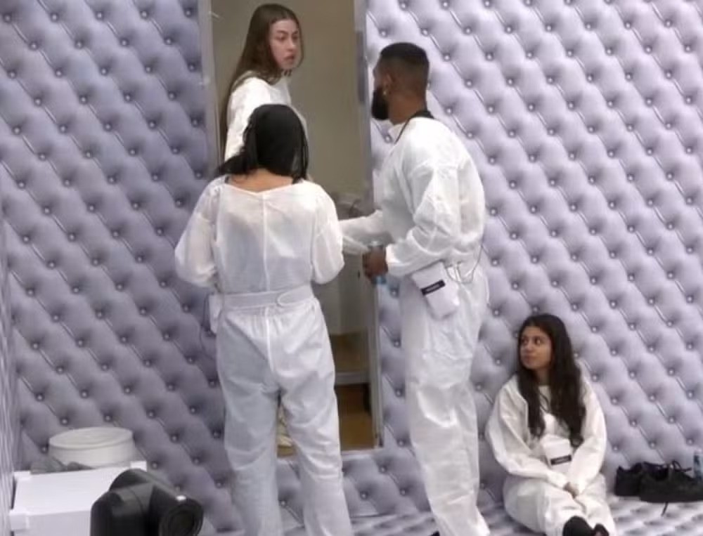No início do programa,uma confusão foi criada no Quarto Branco. Os participantes notaram um cheiro forte no cômodo fechado investigarem o banheiro,então encontraram uma das paredes do banheiro suja de fezes — Foto: Reprodução/Globoplay