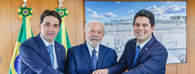 Luiz Inácio Lula da Silva,durante reunião com Silvio Costa Filho (Republicanos- PE),Ministro de Portos e Aeroportos e André Fufuca (PP-MA),Ministro dos Esportes— Foto: Ricardo Stuckert / PR
