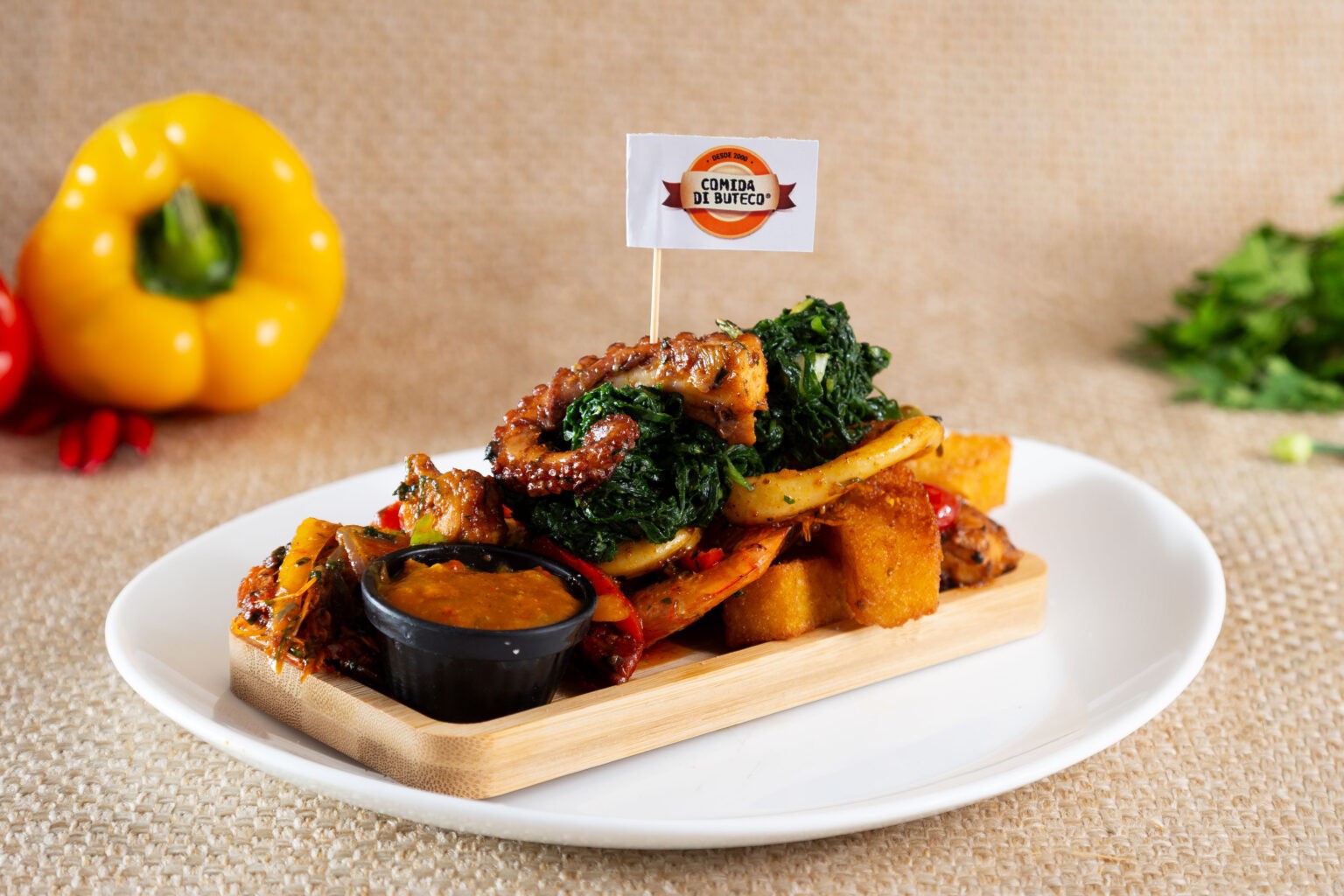 EnCanto Bistrô: a casa estreia com “Minerés”,que leva angu frito,frutos do mar e taioba — Foto: Divulgação/Comida Di Buteco-Unisuam