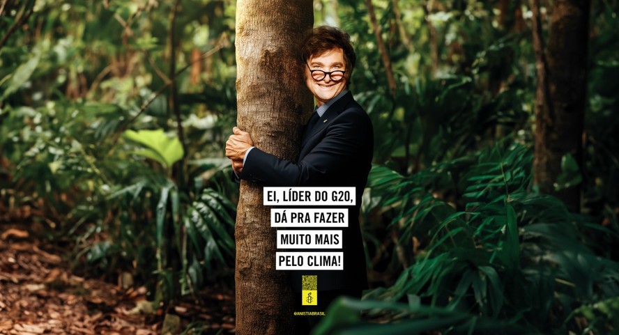 Javier Milei,presidente da Argentina,em montagem da Anistia Internacional Brasil — Foto: Divulgação