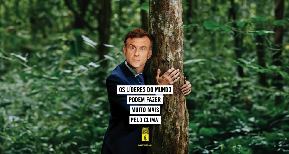 Emmanuel Macron,presidente da França,na montagem da Anistia Internacional Brasil — Foto: Divulgação