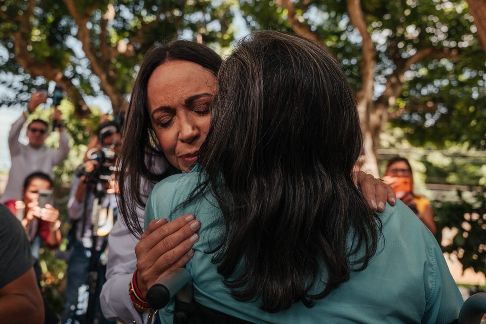 María Corina abraçando apoiadora — Foto: Adriana Loureiro Fernandez / The New York Times