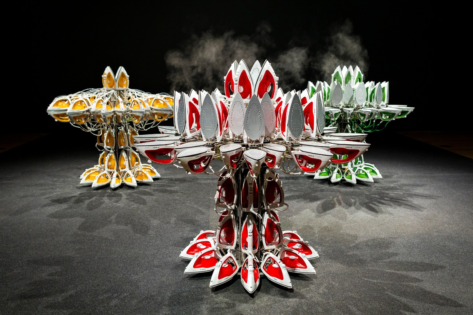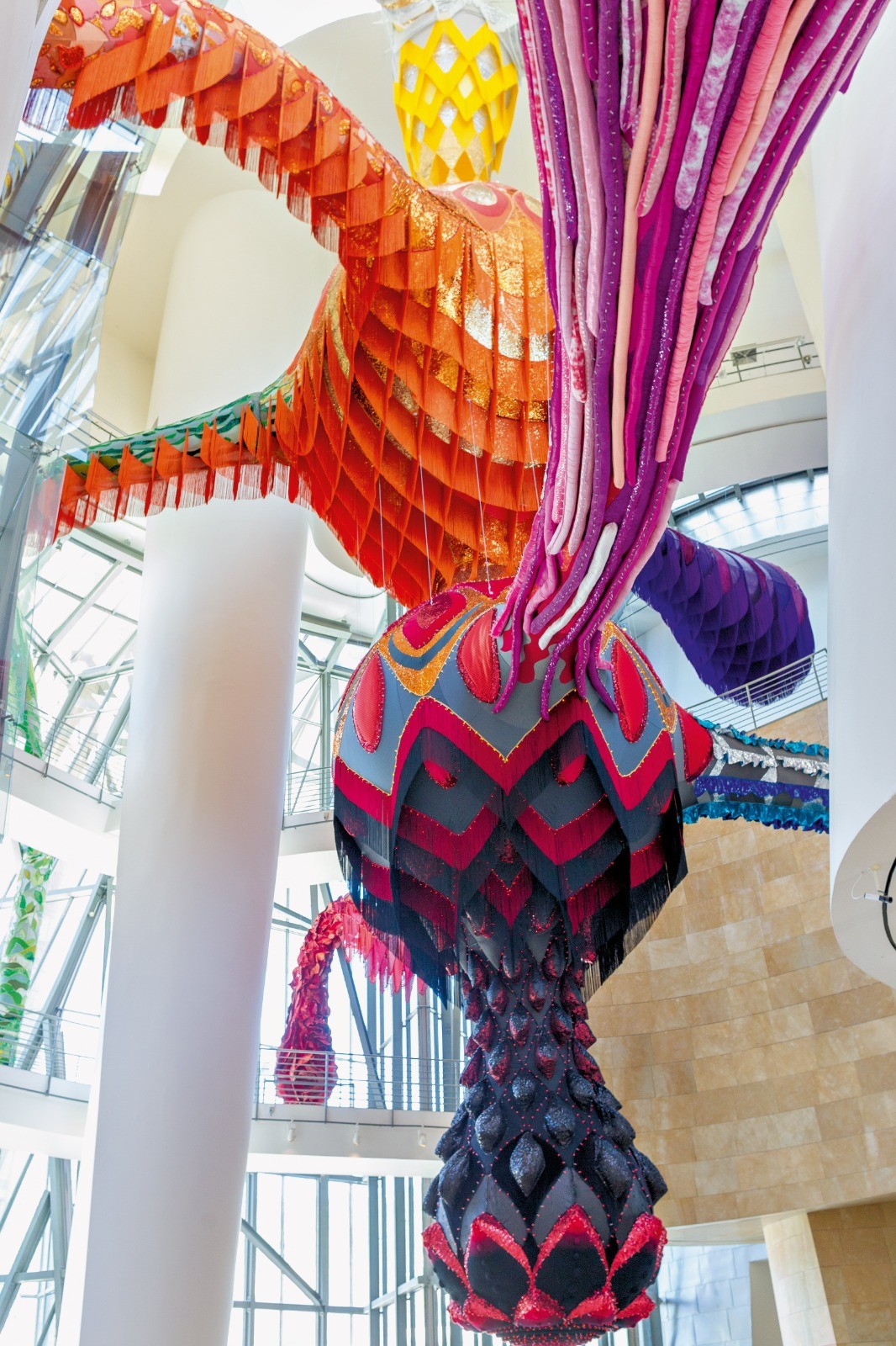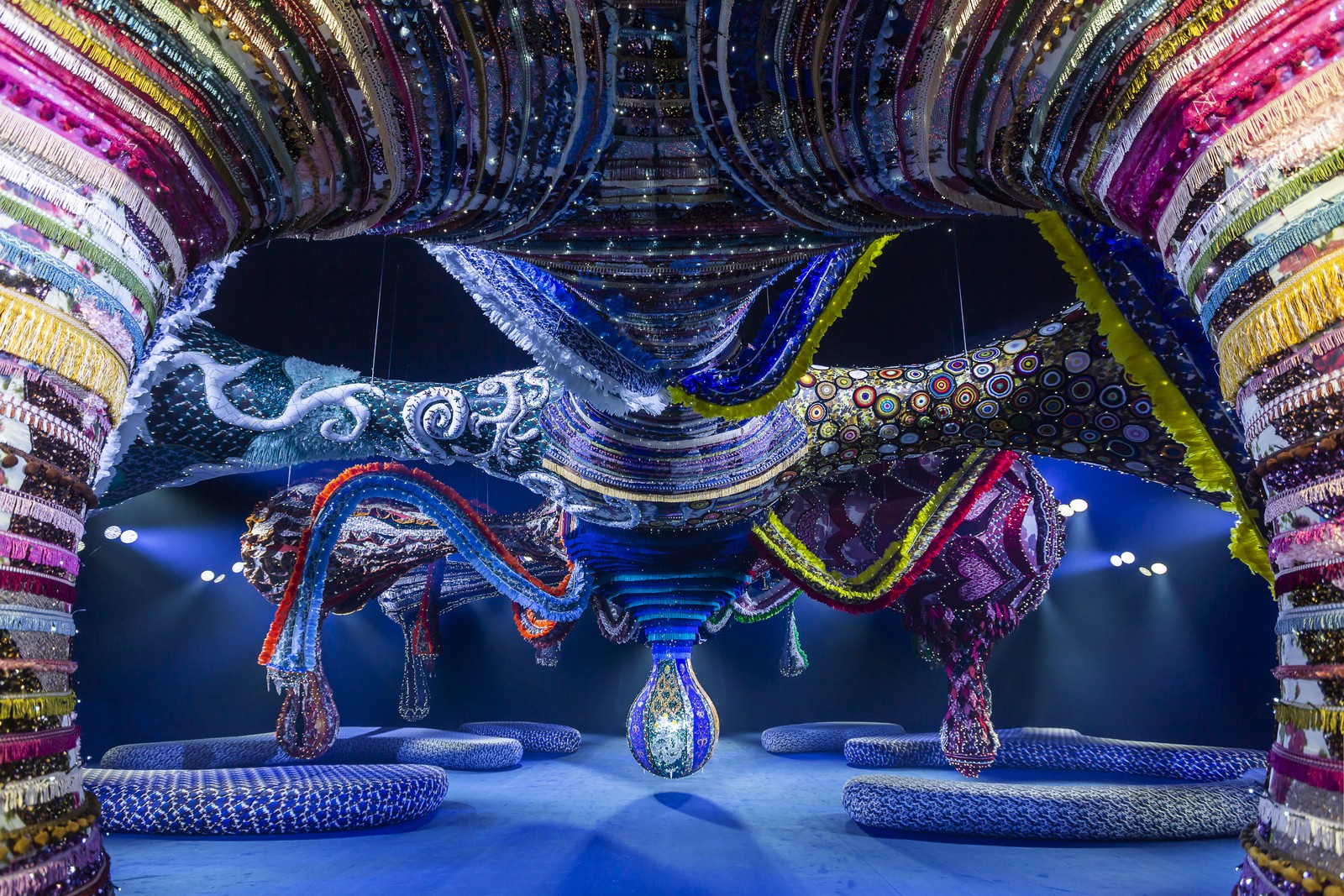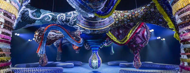 A estrela de “Extravagâncias” é a instalação “Valquíria Miss Dior”,criada pela artista para o desfile de outono-inverno 2023/2024 da maison francesa,em fevereiro do ano passado,e que acabou por virar mais um marco em seus 30 anos anos de trajetória. São 7 metros de altura por 24 de extensão na forma de uma escultura que mescla crochê,20 diferentes tecidos e microluzes de LED. A base fica suspensa por cabos de aço,e braços tentaculares tocam o chão. Na opinião da própria Joana,é a mais bela de suas Valquírias,seres fantásticos que povoam o repertório da artista há duas décadas. Inspiradas no mito escandinavo das mulheres enviadas pelo deus Odin,as Valquírias tinham a árdua missão de escolher vencedores e perdedores de uma guerra. “São deusas guerreiras que retratam as múltiplas dimensões da mulher na sociedade”,explica Joana.