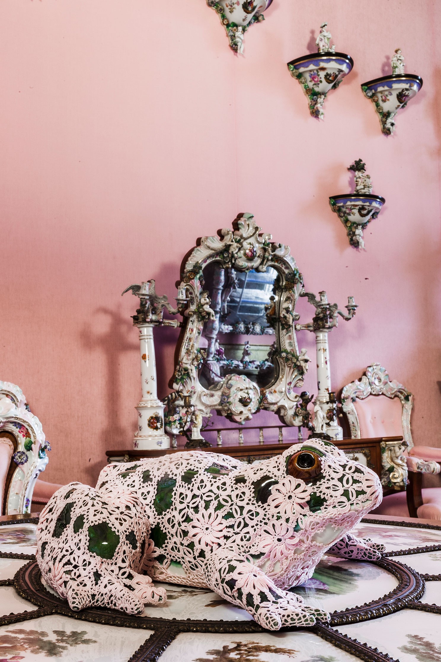 Joana ficou abaladíssima. Até que o empresário Manuel Reis,diretor da Lux,fez o convite para sua ex-segurança expor no fervo da boate. “Era para ficar lá por um mês,mas ficou mais de um ano”,lembra ela. Tempo suficiente para a curadora espanhola Rosa Martinez ver “A noiva” na discoteca e convidar Joana para expor a obra em uma galeria de Barcelona. “Ao longo de 2002,levei o lustre para vários endereços. Comecei a ficar exausta de montar e desmontar aquele candelabro. Levava,em média,três dias para fazer tudo sozinha. Pedi,então,para a Rosa me chamar de novo só quando fosse para um lugar classe A. Ela ficou um ano inteiro sem falar comigo”,recorda-se. No final de 2004,enfim,a curadora voltou a telefonar para Joana,e fez o convite para participar da Bienal de Veneza,que pela primeira vez,em mais de um século,teria uma curadoria assinada por mulheres,entre elas,a própria Rosa. “Foi um momento histórico”,lembra a portuguesa,com poréns. “Não tinha preparado uma estrutura para estar ali nem tinha cartão de visitas. Foi muito duro. Ficava em pé do lado da obra das onze da manhã às sete da noite,e depois voltava para o hotel para chorar de desespero,estava entrando em um novo universo.”
