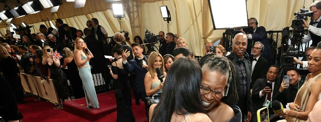 O superabraço de Demi Moore e Whoopi Goldberg no Oscar 2025— Foto: VALERIE MACON / AFP