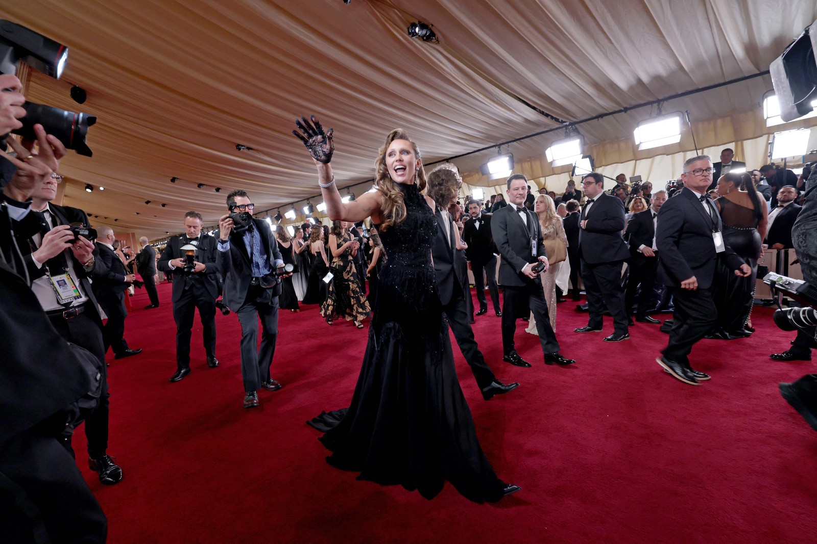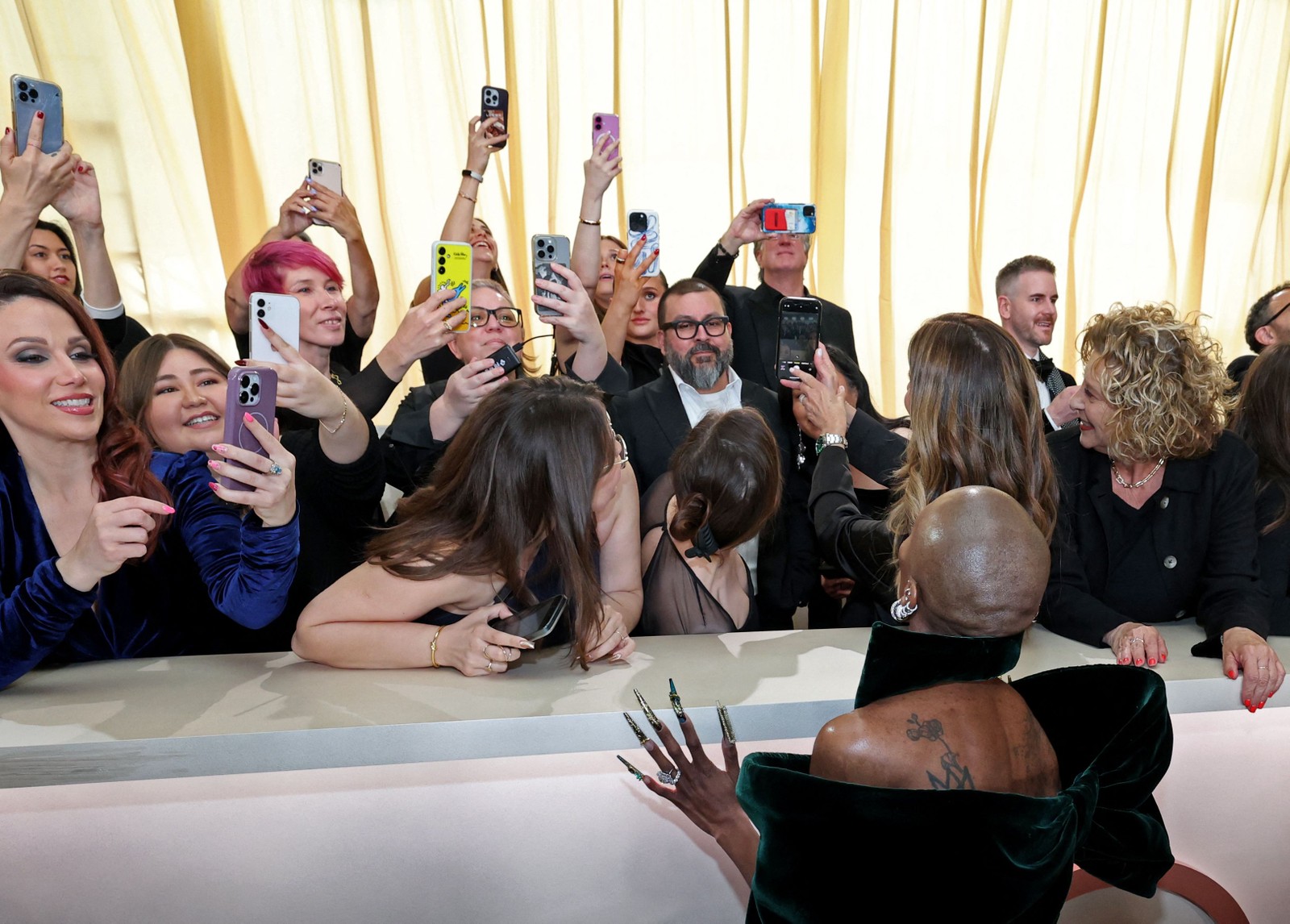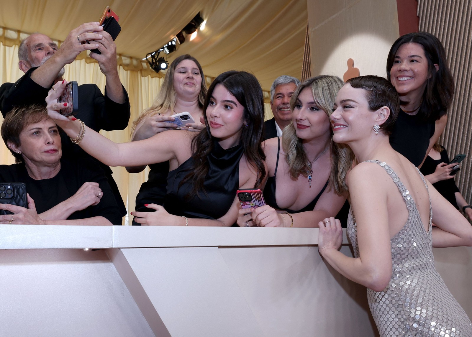 Emma Stone tira fotos com fãs no tapete vermelho do Oscar 2025 — Foto: VALERIE MACON / AFP