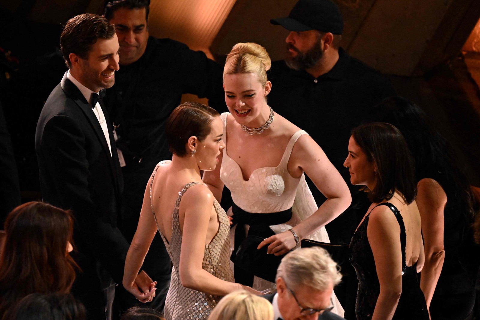 Papo animado entre Emma Stone e Elle Fanning — Foto: Patrick T. Fallon / AFP