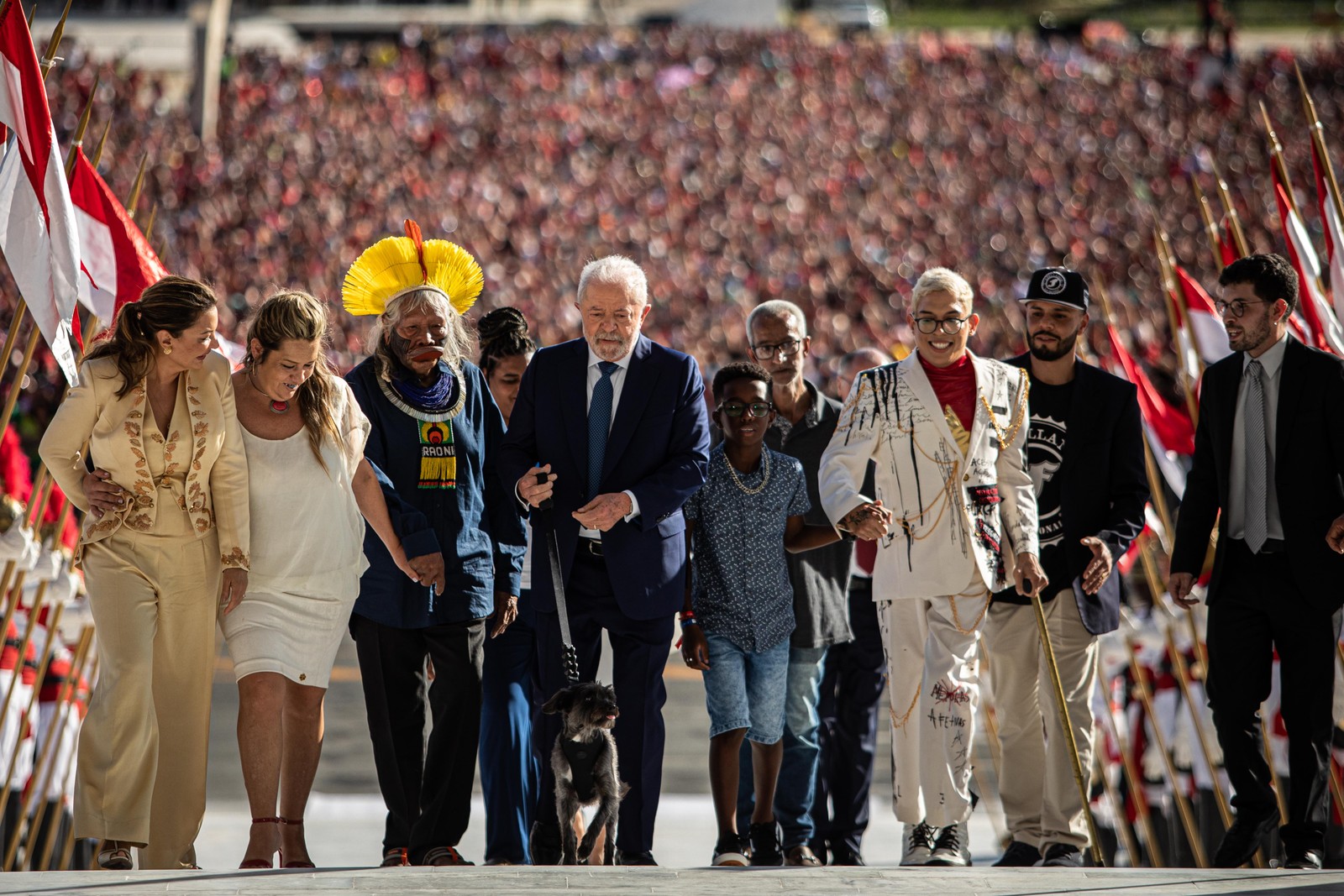 Com a ausência do antecessor,Lula subiu a rampa e recebeu a faixa das mãos do povo — Foto: Hermes de Paula/Agencia O Globo