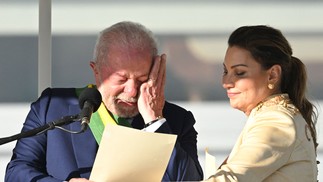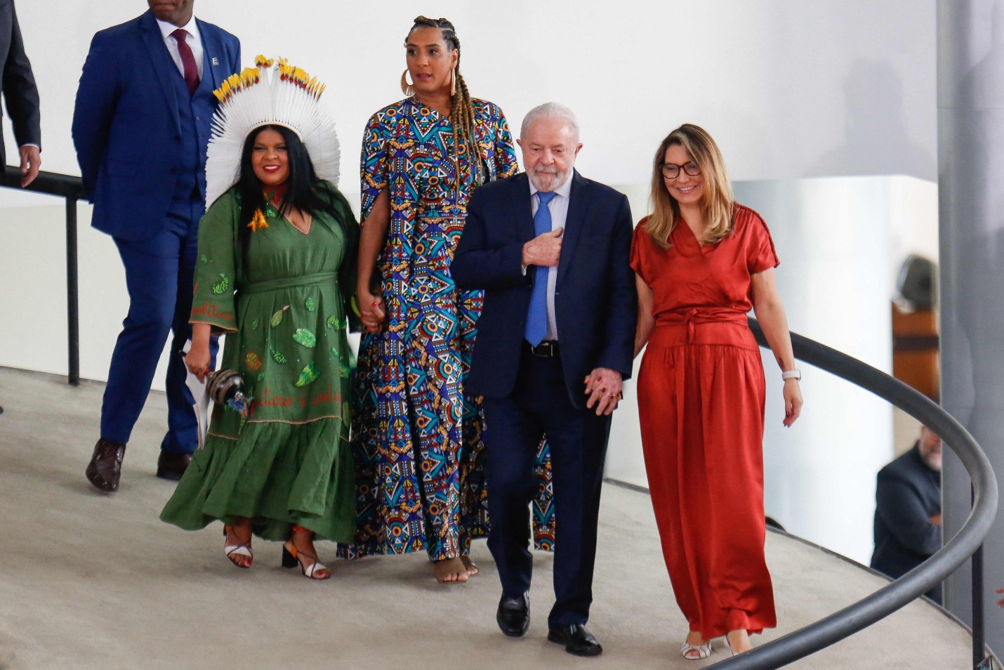 Presidente Lula,a primeira-dama Janja,em cerimônia de posse de Anielle Franco e Sônia Guajajara como ministras — Foto: Sergio Lima / AFP