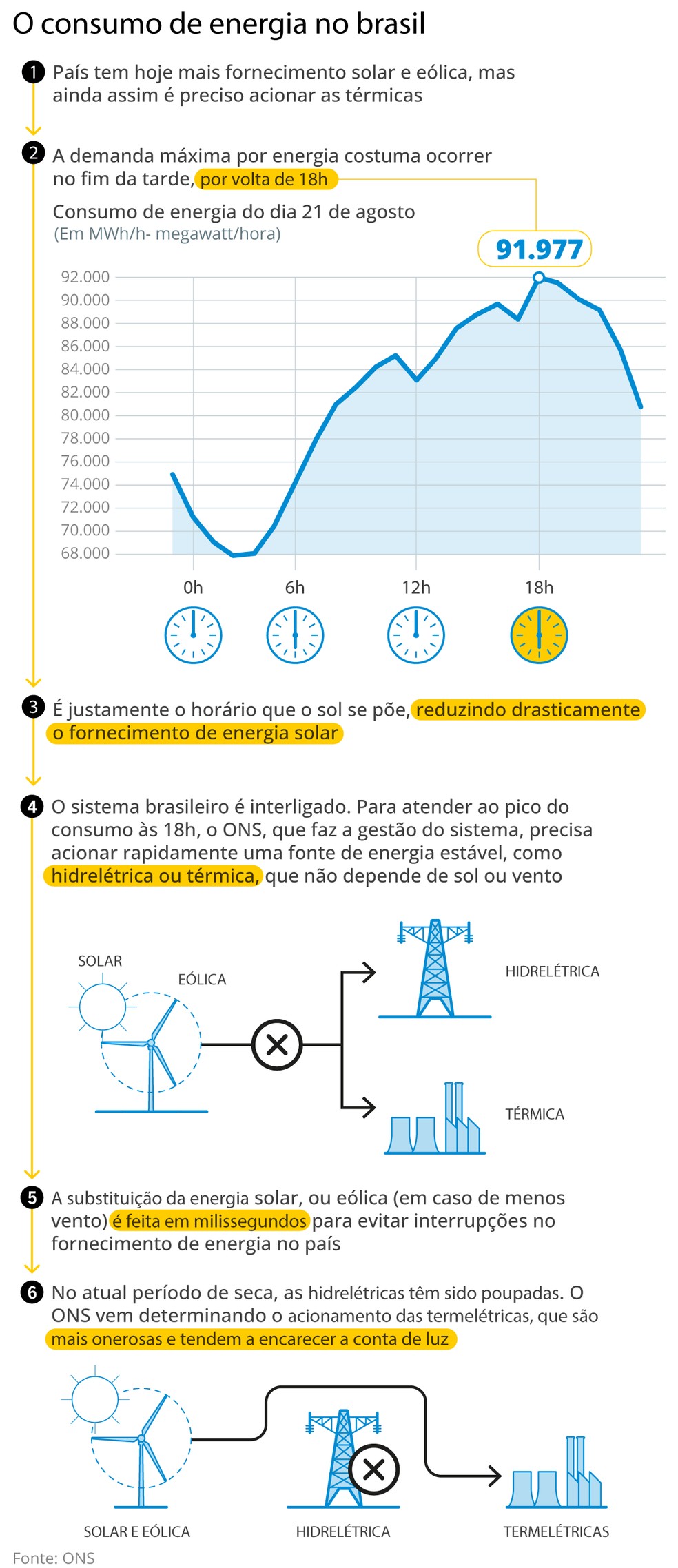 Dados do Operador Nacional do Sistema (ONS,que faz a gestão do sistema elétrico no país,que é quase totalmente interligado) mostram que entre 11h e pouco depois de meio-dia da última terça-feira,a geração solar colocou quase 30 mil megawatts (MW) no sistema. Pouco depois das 18h,essa geração estava abaixo de 100 MW — a média do consumo diário fica em 80 mil MW. O pico da demanda,acima de 91.000 MW,ocorre entre 18h e 19h,horário do tombo na geração solar.
