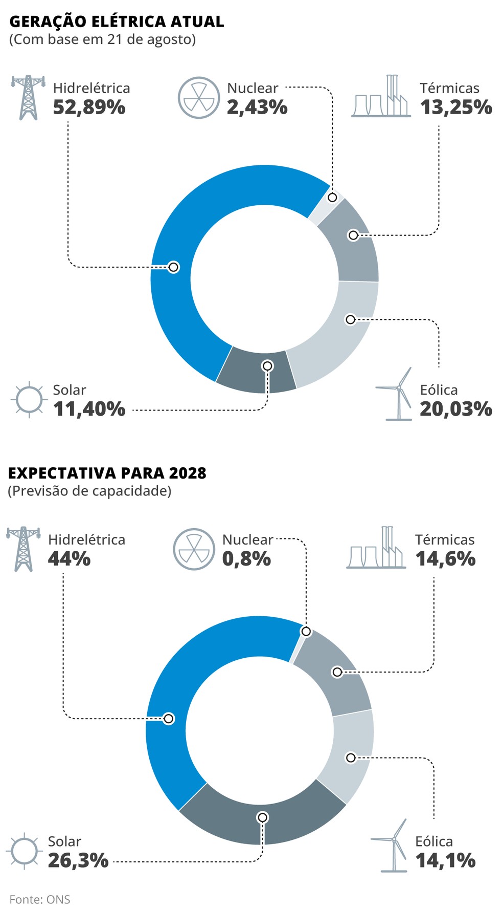 De acordo com a equipe do ministro Alexandre Silveira,o cenário “não é confortável”,porém não causa riscos ao sistema. É preciso fazer gestão de recursos,disse uma autoridade envolvida nos estudos. Levantamento do ONS em posse do governo demonstra uma coincidência de carga elevada e baixa geração nas usinas eólicas no fim da tarde e início da noite. Outra medida em estudo é a importação de energia da Argentina e do Uruguai.
