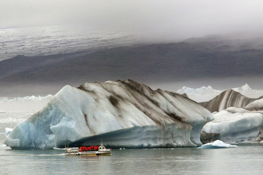 Barco visita geleiras no Parque Nacional Vatnajokull,na Islândia — Foto: Marcel Mochet/AFP