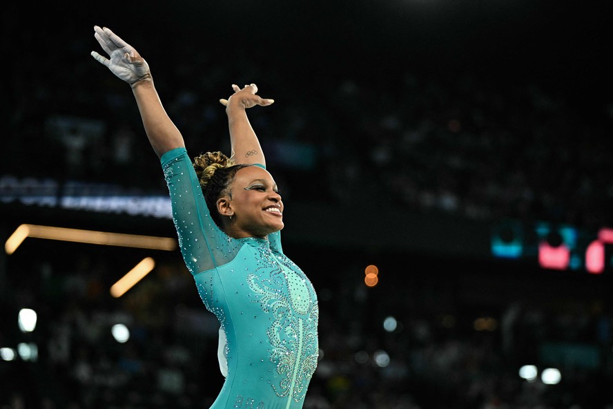 Rebeca Andrade durante apresentação no solo — Foto: Gabriel BOUYS / AFP