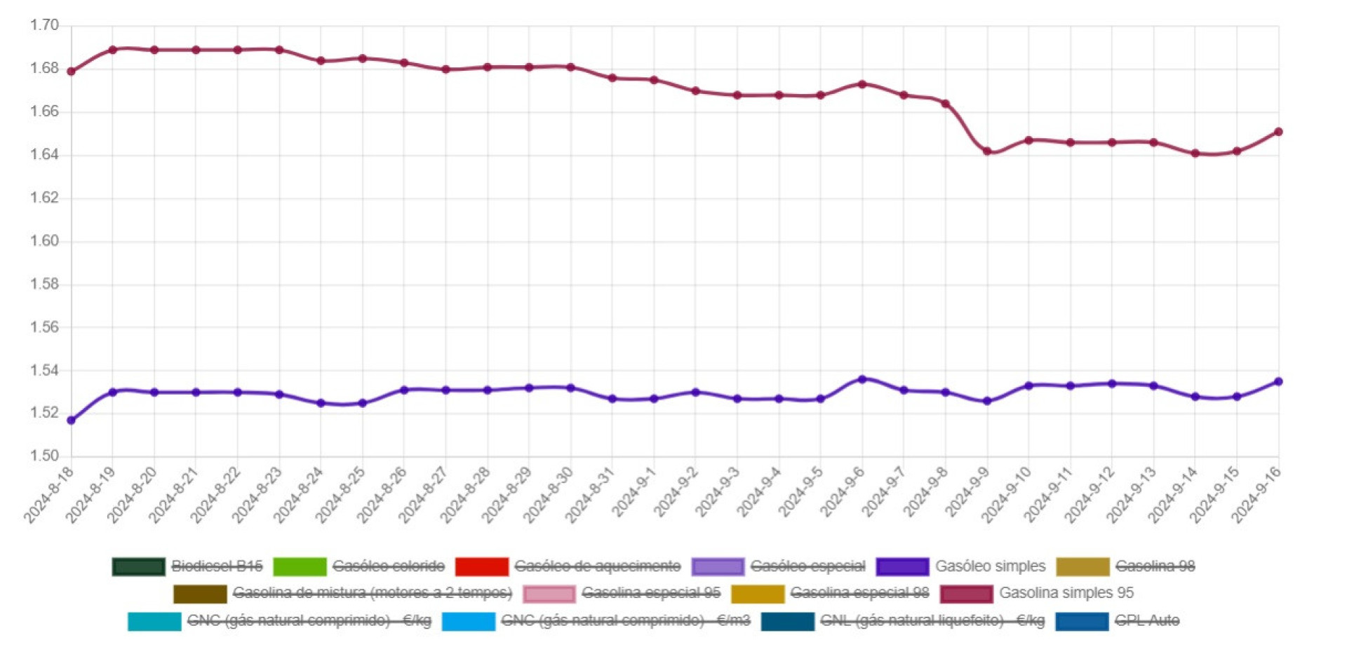 De acordo com os dados da Direção-Geral de Energia e Geologia (DGEG),na segunda-feira,16 de setembro,o preço médio do gasóleo simples era de 1,535 €/litros,enquanto a gasolina simples 95 custava 1,651 €/litro.