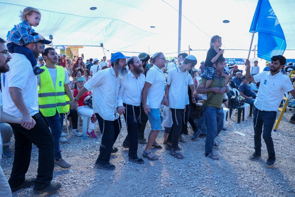 Ativistas israelenses de extrema direitaparticipam de uma reunião perto da fronteira com Gaza que pede o estabelecimento de um novo assentamento judaico no enclave — Foto: MENAHEM KAHANA/AFP