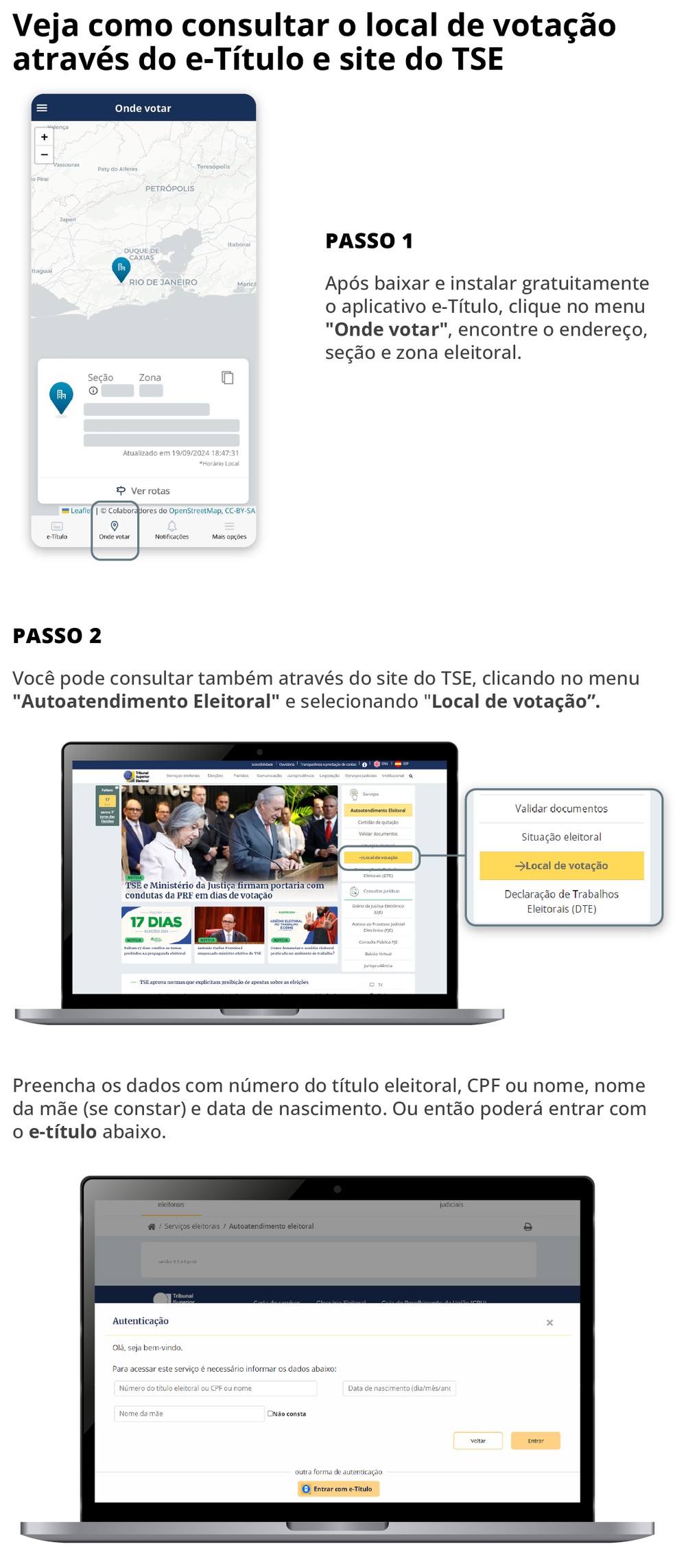 A consulta do local de votação é simples: pode ser feita no site do Tribunal Superior Eleitoral pelo nome,número do título ou CPF do eleitor. Nos três casos,é preciso fornecer a data de nascimento e o nome da mãe. O eleitor também pode fazer a consulta pelo WhatsApp automatizado do TSE,no número (61) 9637-1078. Basta entrar e marcar a opção 6.