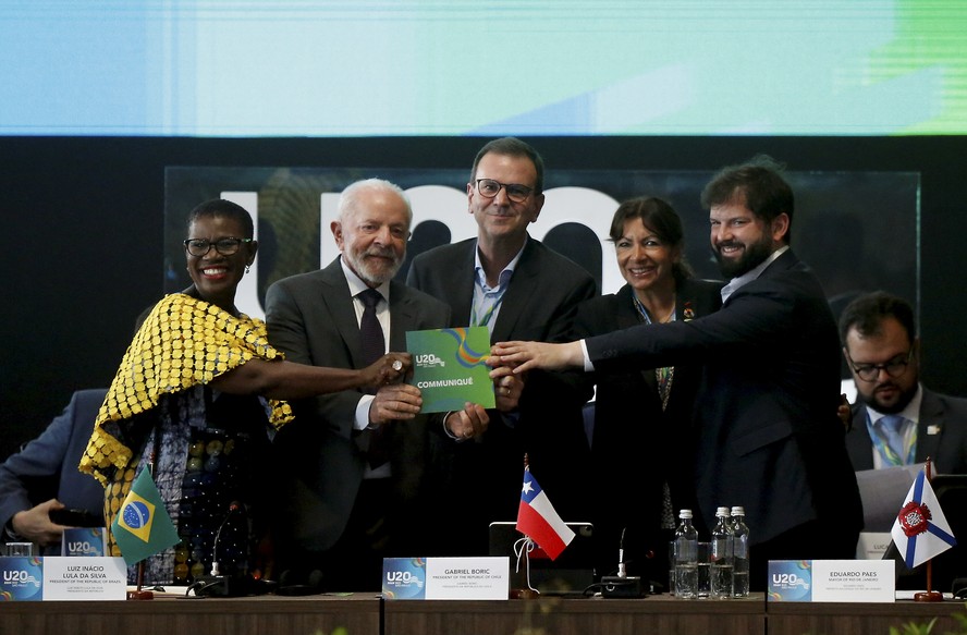 Presidente Lula recebe o 'communiqué' do U20 das mãos do prefeito do Rio,Eduardo Paes,junto às prefeitas de Freetown,Aki Sawyerr,e de Paris,Anne Hidalgo,e do presidente do Chile,Gabriel Boric — Foto: Fabiano Rocha / Agência O Globo