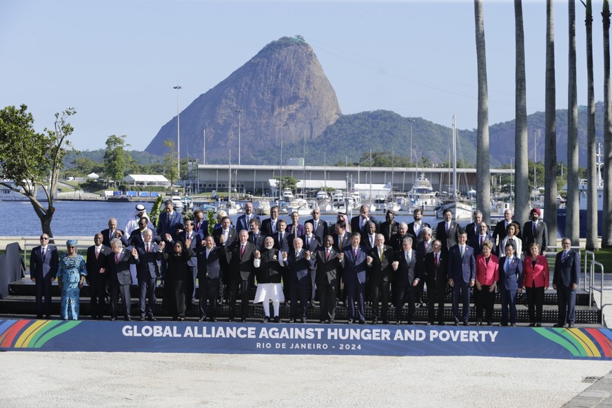 Líderes do G20 posam para foto oficial após a criação da Aliança contra a Fome a Pobreza — Foto: Domingos Peixoto / Agência O Globo