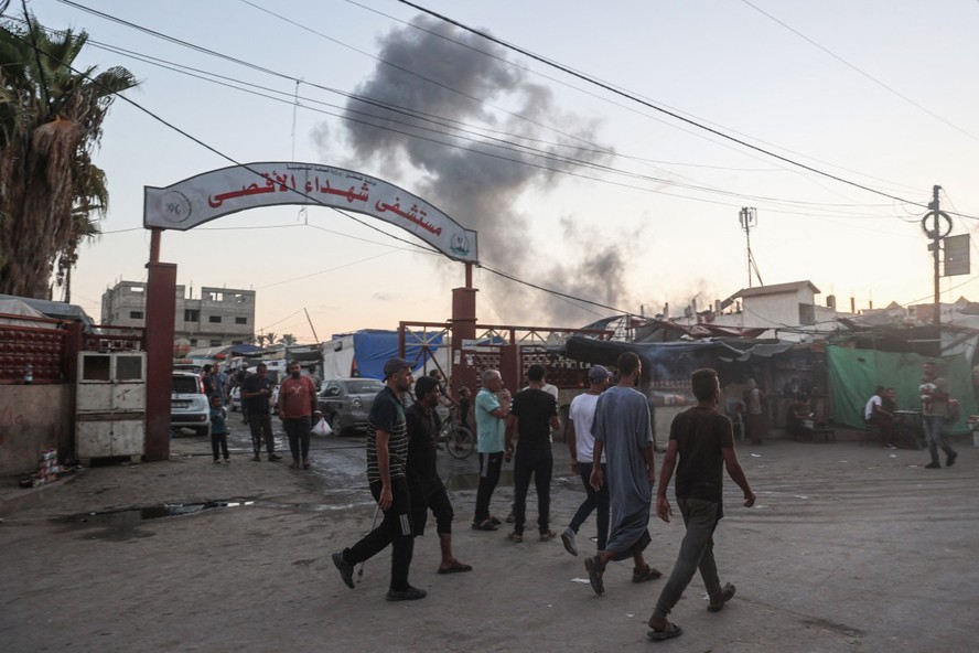 Palestinos passam pela entrada do hospital dos Mártires de al-Aqsa enquanto a fumaça sobe durante o bombardeio israelense de Deir el-Balah,no centro da Faixa de Gaza,em 6 de agosto de 2024 — Foto: EYAD BABA/AFP