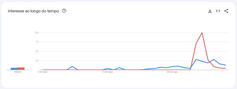 Gráfico do Google Trends compara interesse de buscas por "Pablo Marçal PCC" (em azul) e "Pablo Marçal atentado" (em vermelho) e indica pico de pesquisas nos dias 30 e 31 de agosto — Foto: Reprodução
