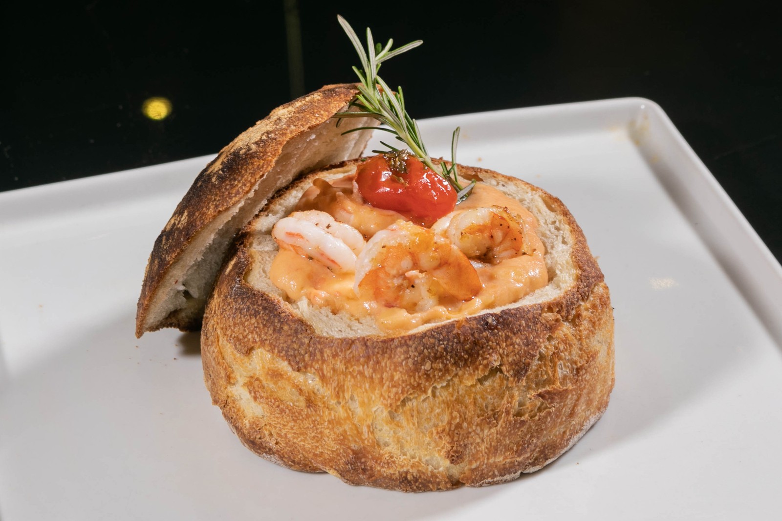 No pão rústico. O Parla! oferece o creme de camarão com alho-poró — Foto: Divulgação/Eduardo Duarte