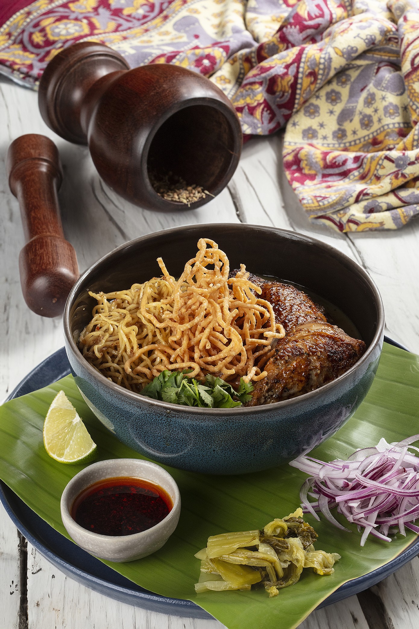 Colorida. O Nam Thai (97042-6575),do chef David Zisman,tem a sopa birmanesa de camarão e macarrão (R$ 47,79),com gengibre,caldo de vegetais e cebola roxa e decorada com endro — Foto: Divulgação
