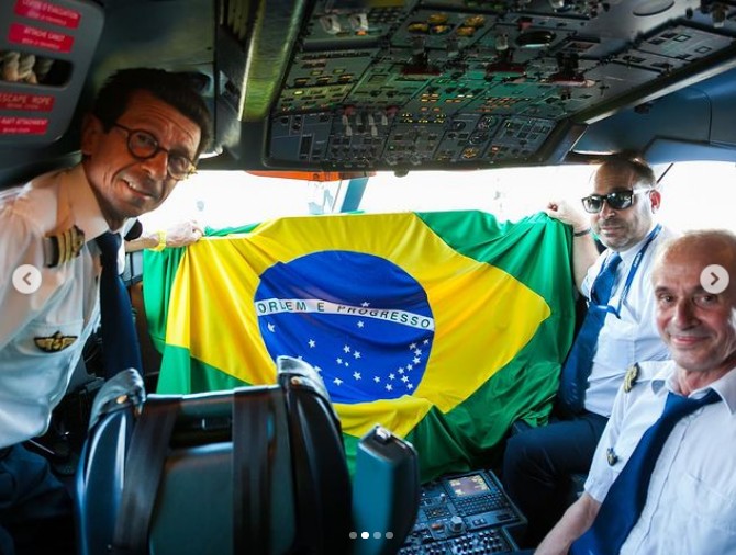Equipe que atuou na chegada de BelugaST no Brasil — Foto: R. Cozzato/Instagram Airbus