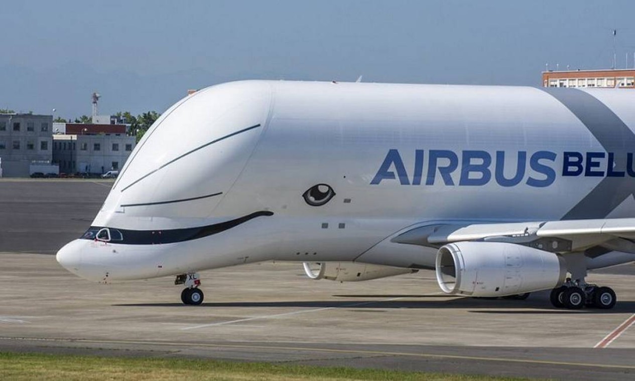 A aeronave é conhecida pelo seu formato exótico,que se assemelha a uma baleia beluga,também conhecida por baleia-branca. — Foto: Divulgação/ Airbus