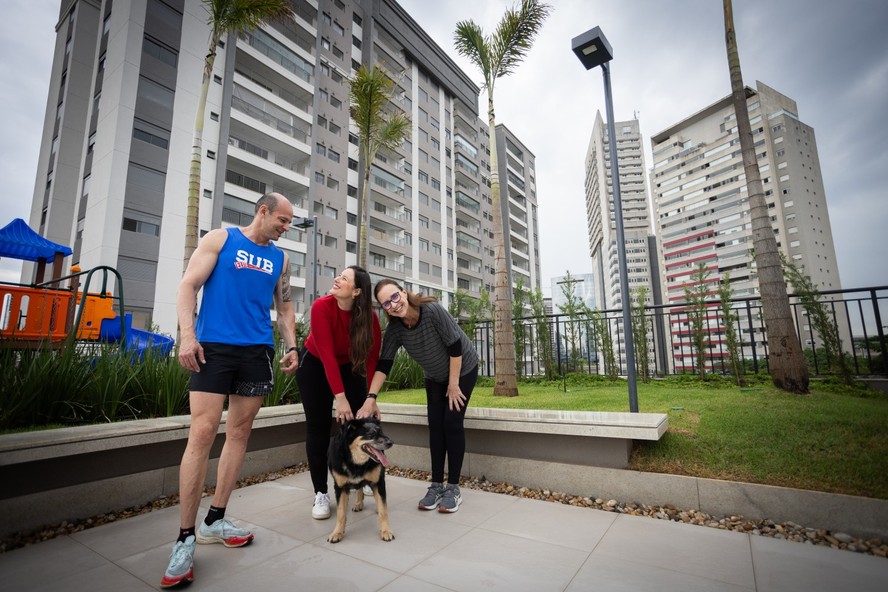Espaço pet e minimercado selaram a escolha de Renato e Thayná por um condomínio em SP,onde viverão com a mãe dela,Cecília,e o cão Petit — Foto: Maria Isabel Oliveira/Agência O Globo