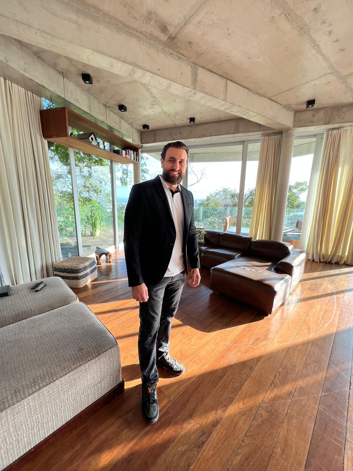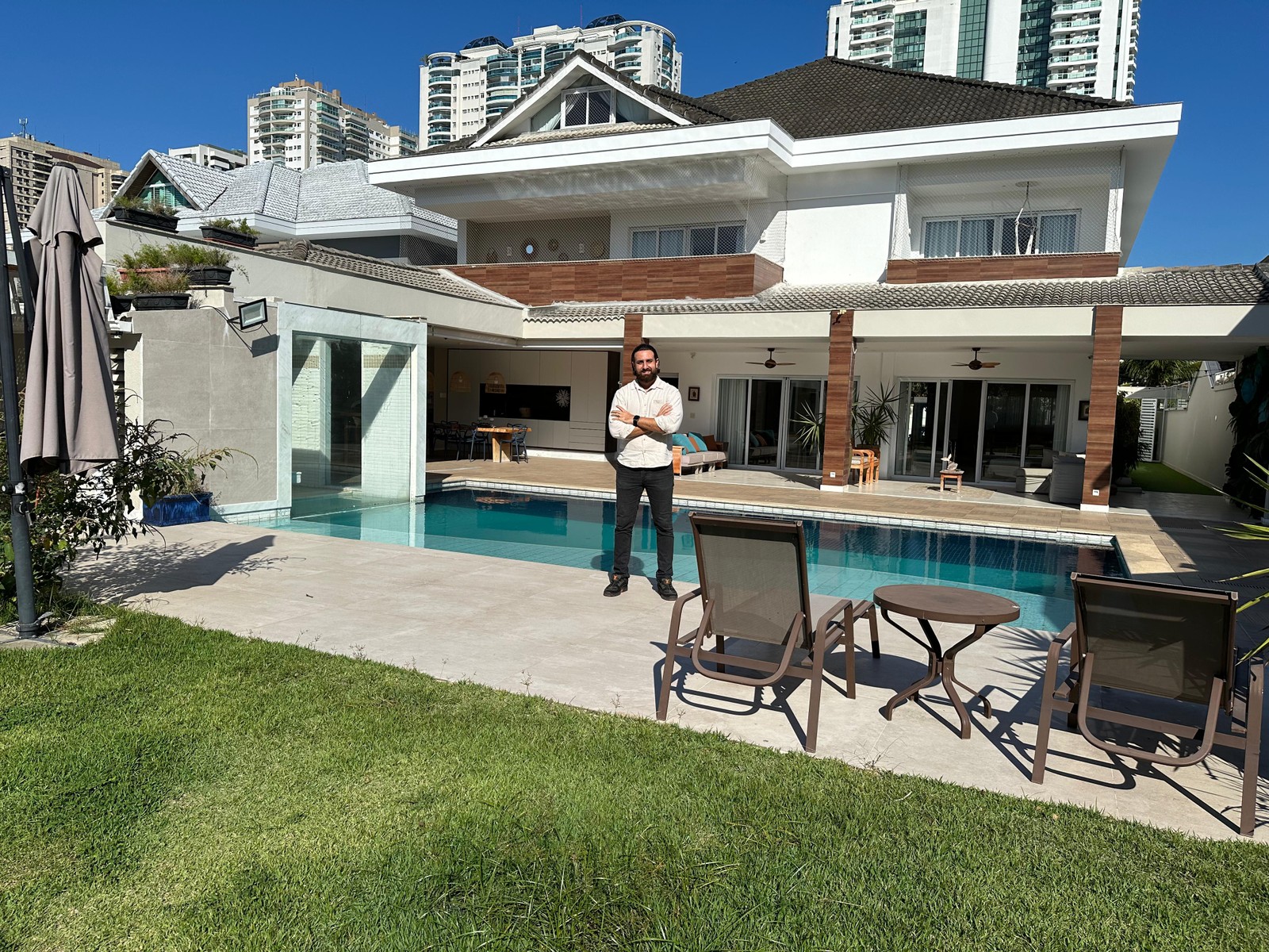 O corretor de imóveis Michael Magno na casa do ator Caio Blat,na Barra da Tijuca,que está disponível para compra ou aluguel por temporada — Foto: Divulgação