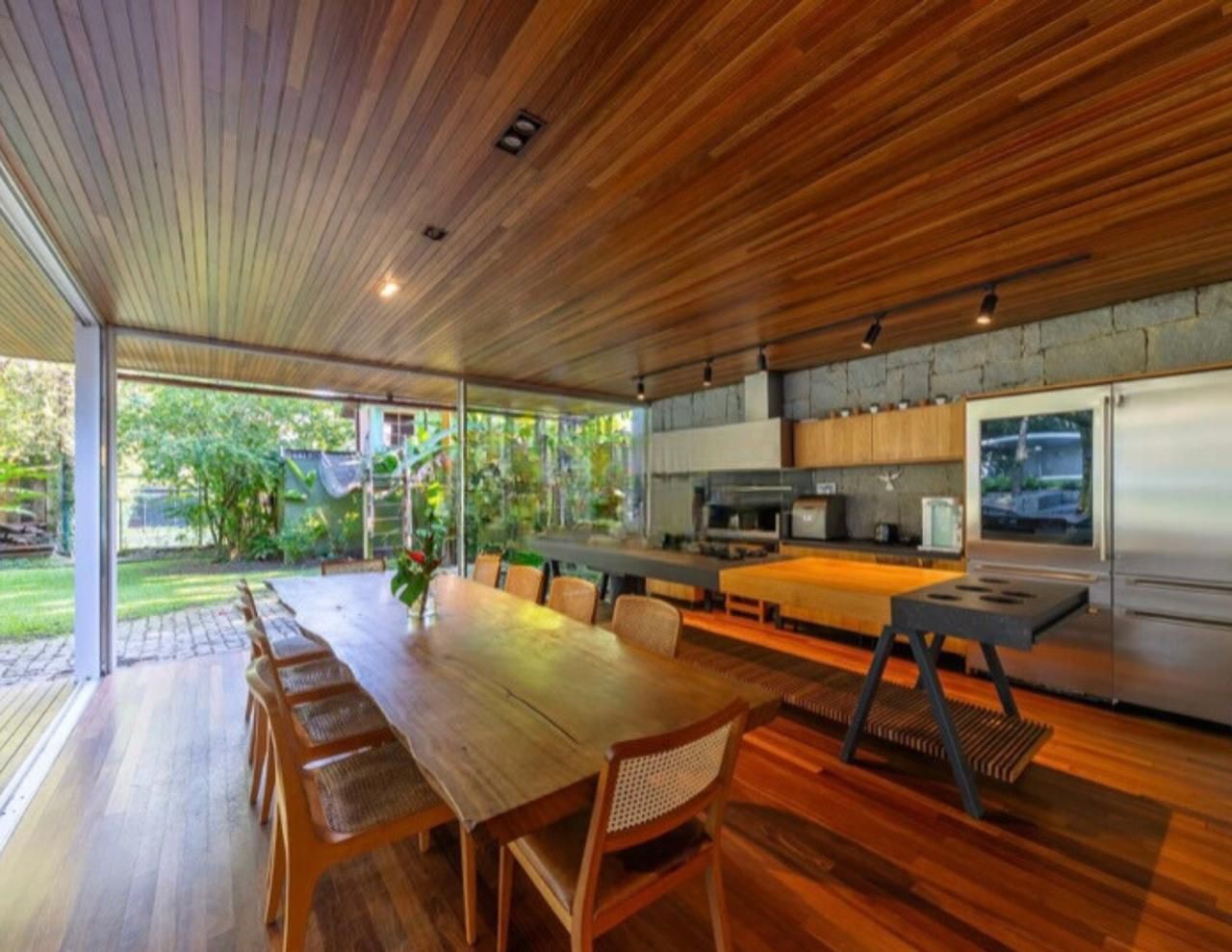 Cozinha de madeira e com paredes de vidro da mansão no Itanhangá dos atores Bruno Gagliasso e Giovanna Ewbank disponível para venda — Foto: Divulgação