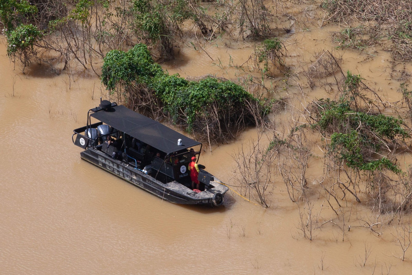 Peritos da Polícia Federal examinam um barco apreendido em Atalaia do Norte. Força tarefa investiga sinais de escavações em uma área próxima ao local onde jornalista e indigenista foram vistos pela última vez. — Foto: JOAO LAET / AFP