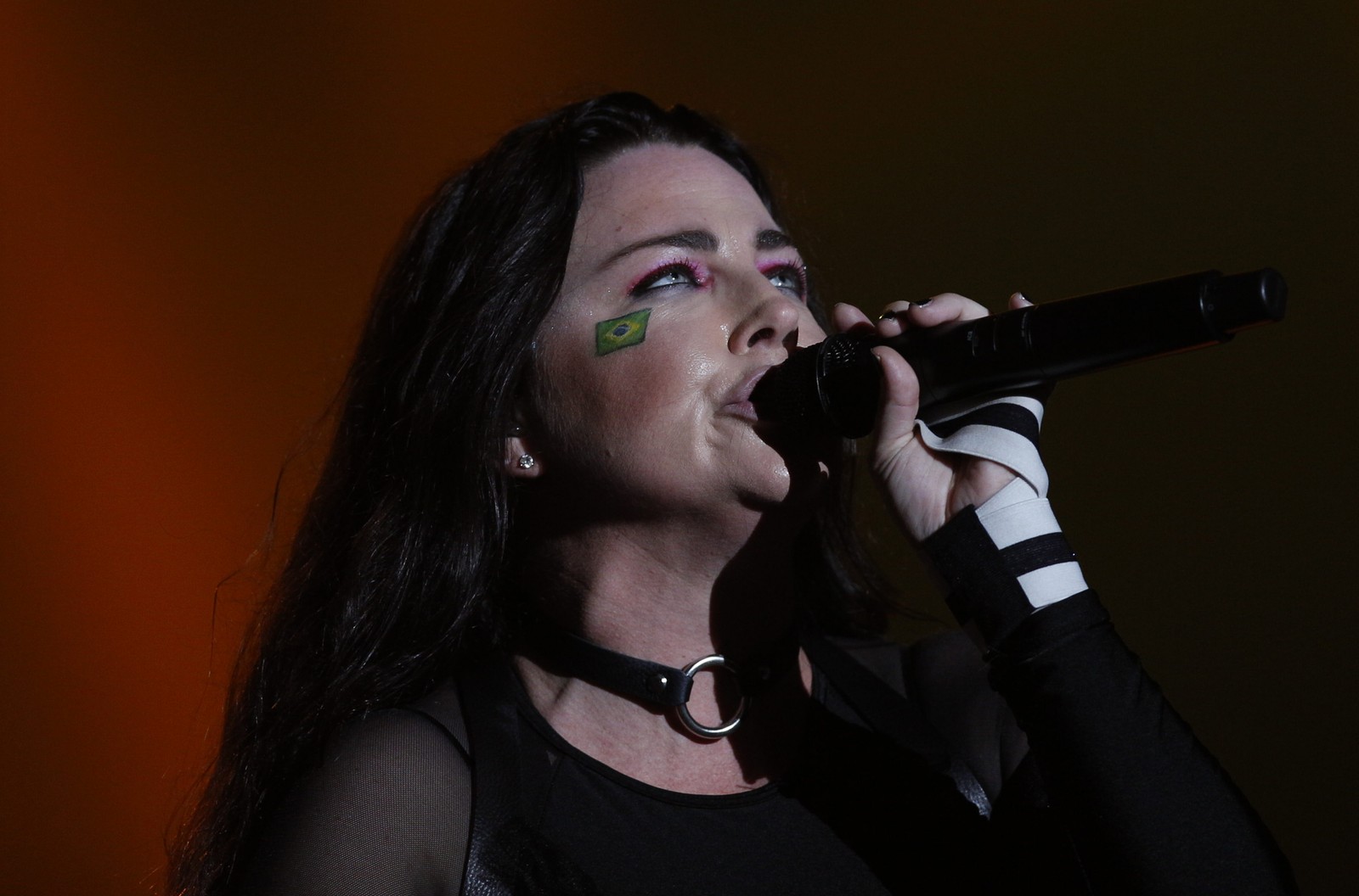 Amy Lee,vocalista da banda Evanescence,aparece com maquiagem com bandeira do Brasil no rosto — Foto: Alexandre Cassiano/Agência O Globo